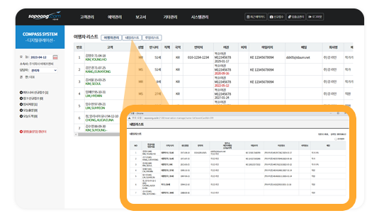 등록된 여행상품 참가자의 필수정보 구성된 네임리스트(성명, 나이, 국적, 여권 유효기간 자동 점검 ,비자 점검 등)