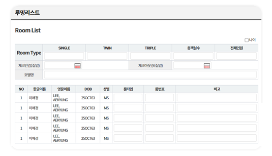등록된 여행 참가자의 루밍리스트 (빠르고 손쉽게 전산처리로 루밍리스트 등록하고 등록 자료는